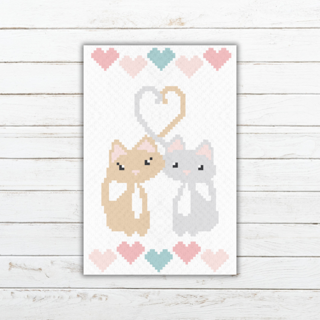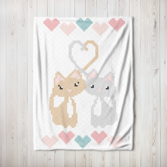 Tails of Love is where creativity and coziness come together. This c2c crochet blanket pattern features two cats, one tan and one gray, cuddled sweetly together with their tails entwined into a heart. This blanket is framed at the top and bottom with hearts in light pink, medium pink, and teal. Add a touch of love to any room with this heartwarming blanket or create a memorable gift for the cat lover or special someone in your life.