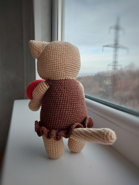 To make Valentines the Cat Crochet Pattern Sweet Kitty with a Big Heart Amigurumi you will need: Light brown yarn of YarnArt Jeans (EU: 160 m/50 gr, USA: sport, UK: 5 ply, 07 color) - the main color - 39 gr, Red yarn of YarnArt Jeans (color 26) - for the heart - 16 gr, Dark brown yarn of YarnArt Jeans for (40 color) - for the dress - 21 gr, White yarn of YarnArt Jeans (62 color) - for eyes - a little, Thin black yarn for mouth embroidery, Safety eyes for toys 15 mm, Fiberfill. Tools required: Crochet hook 2.5 mm, Sewing needle, Scissors, Stitch markers (optional).