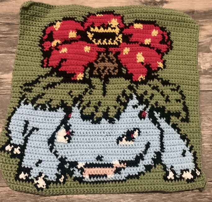 This Venusaur square was designed for a Pokémon blanket but can be edited to make a sweater, shirt, tote bag, tapestry and much more!! This is a a PDF file for the pattern ONLY