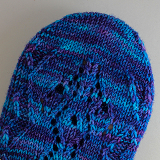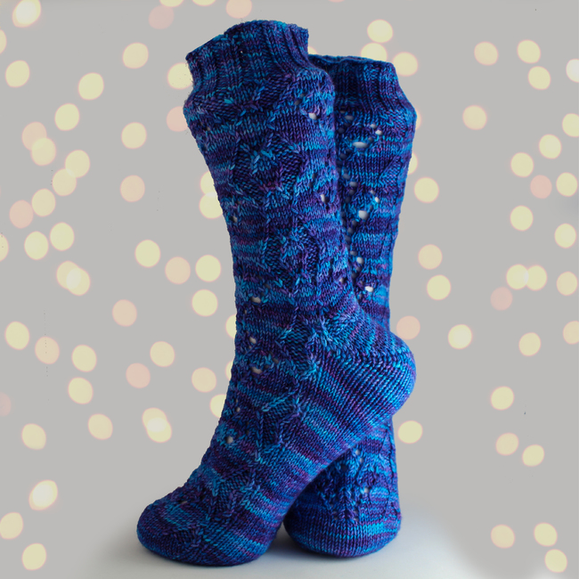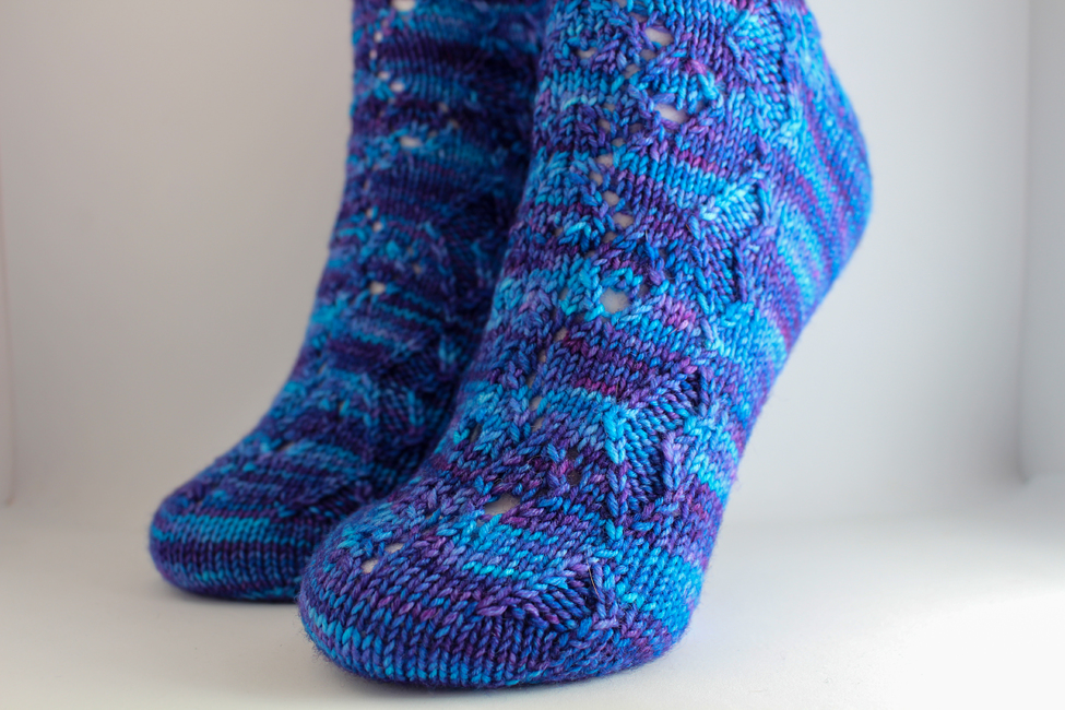 Worked in the round, Vincent contains both cuff-down and toe-up written directions and a chart for the pattern stitch. The pattern has instructions for an afterthought heel, but you may substitute whatever heel you enjoy using.