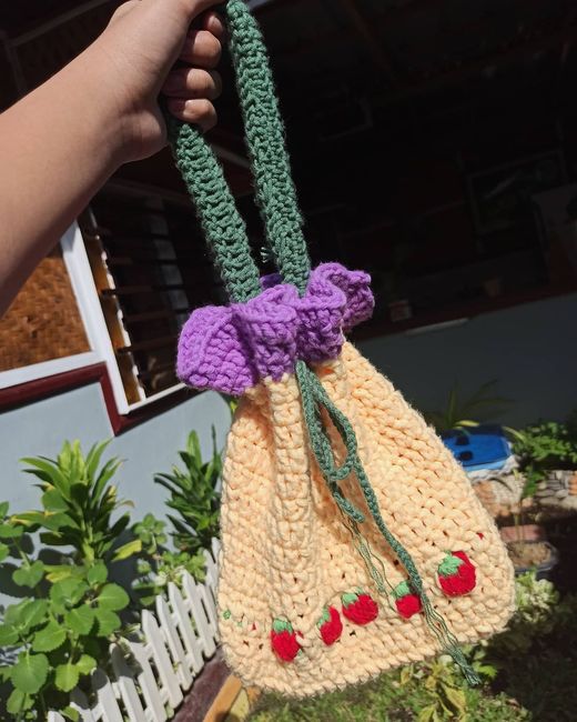 To make Vinchet@qs Mina Inspired Strawberry Pouch you will need: Yarn: Milk Cotton Yarn 8plyColors: Red 50g, Light Yellow 100g, Autumn Green 50g, Purple 60gYarn: Milk Cotton Yarn 5plyColors: Mustard Green 50g. Tools required: Crochet Hook: 4.5mm.
