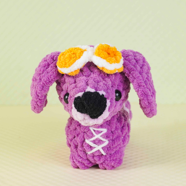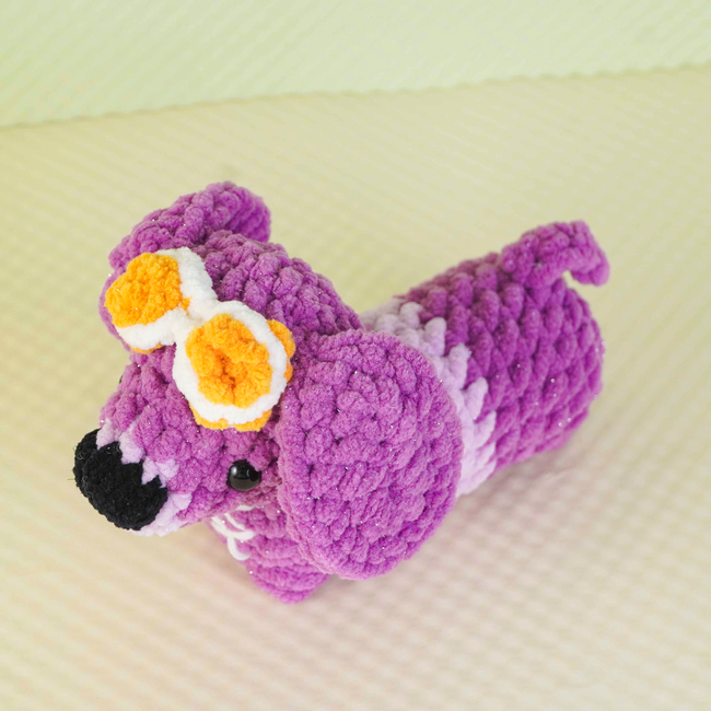 To make Violet Bloom Dachshund Crochet Pattern you will need: Color: Light purple, Dark purple, Orange, White, Stitch marker Sewing needle Scissors Fiberfill Plastic safety eyes (8mm). Tools required: 4.0mm.