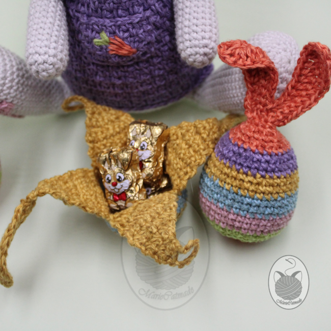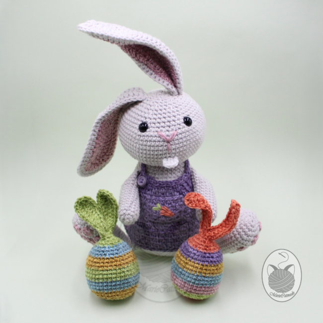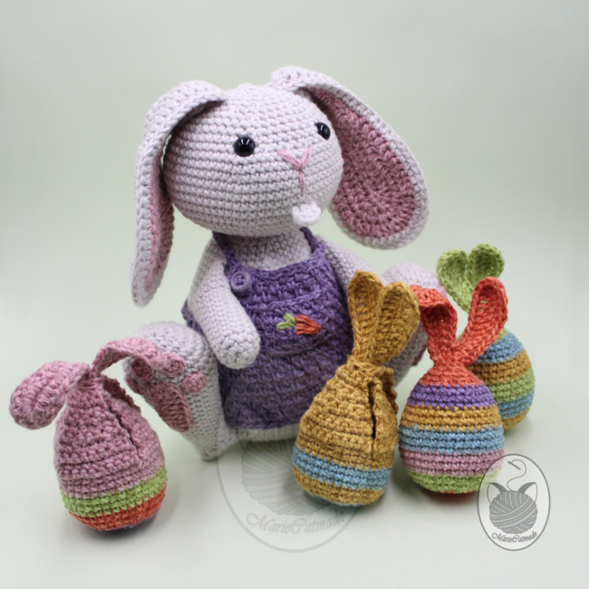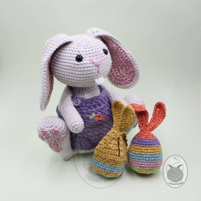 MarieCatmade designed the Violet the Easter Bunny pattern. Find more of their patterns on their Ribblr shop page.