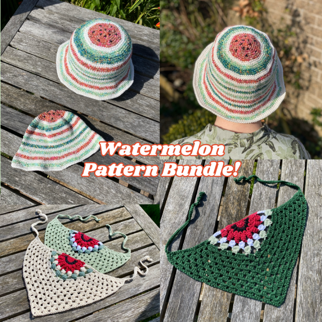 This bundle includes the Watermelon Bucket Hat & the Watermelon Bandana patterns! The bucket hat can be made in 3 sizes: baby-toddler, child & adult. These patterns make great summer accessories and 50% of the profits from each sale goes to a charity supporting people in Gaza.