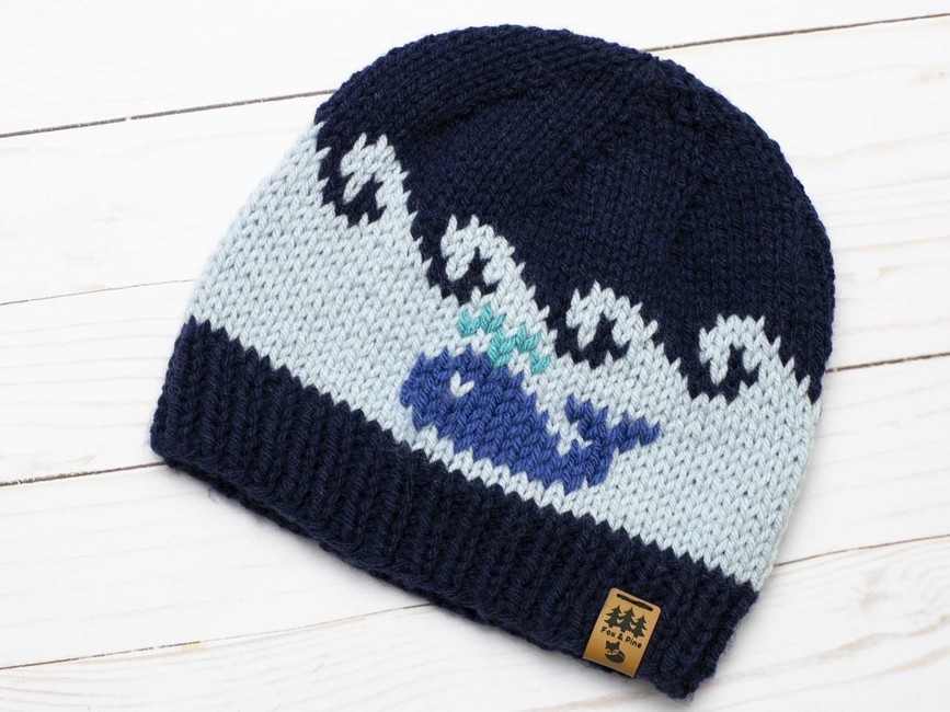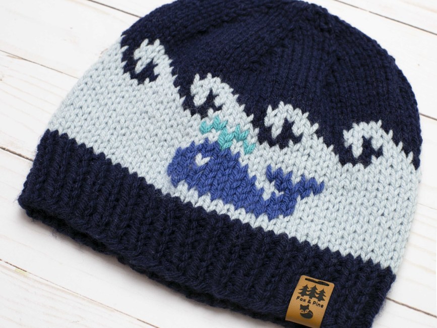 Our whale medium weight hat knitting pattern is perfect for making handmade gifts for your loved ones, young and old. The hat is knit in the wave pattern and the whale is added afterwards using the duplicate stitch technique to make it pop.