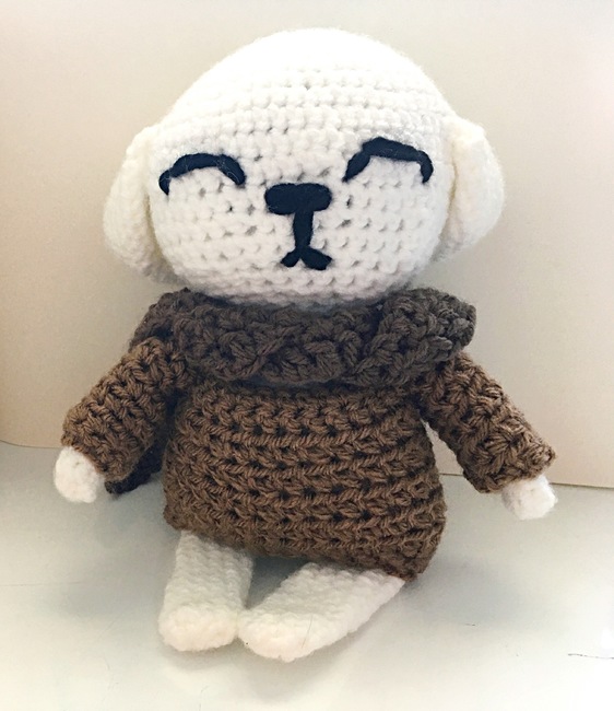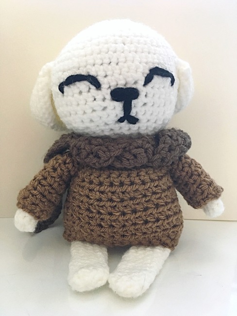 A crochet white puppy with a brown sweater and a dark brown scarf.