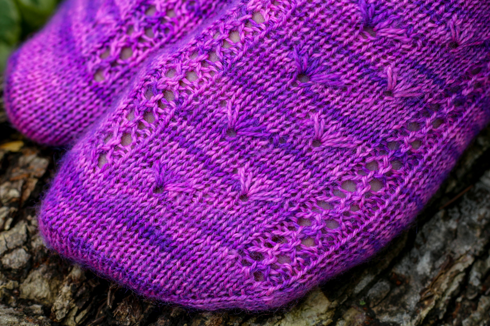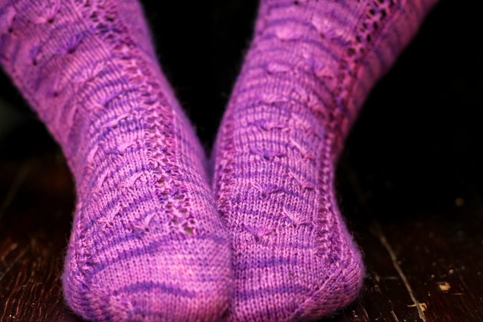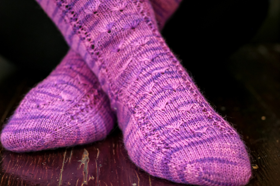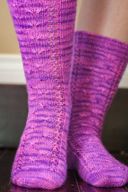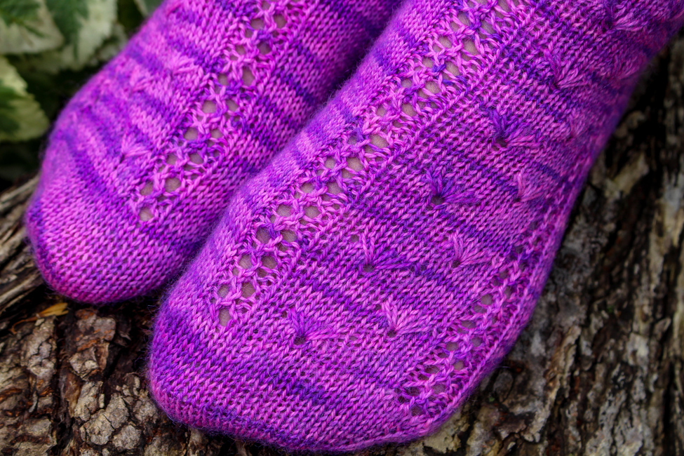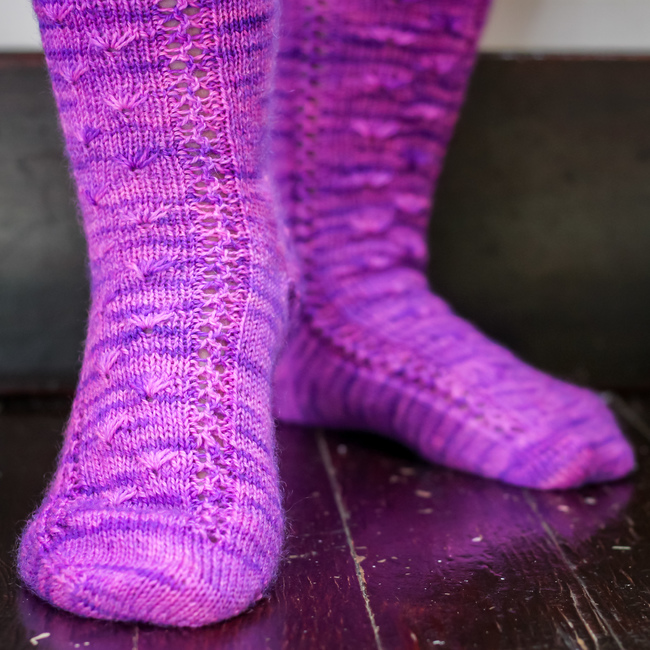 Worked in the round, Wildflowers contains both cuff-down and toe-up written directions and a chart for the pattern stitch. The pattern has instructions for an afterthought heel, but you may substitute whatever heel you enjoy using.
