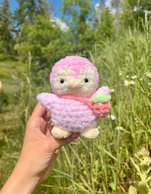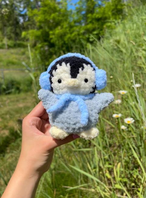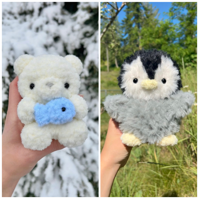 This bundle includes the patterns for a baby bear plushie and a baby penguin plushie! It also comes with the patterns for a fish, earmuffs, scarf, and a strawberry bag.