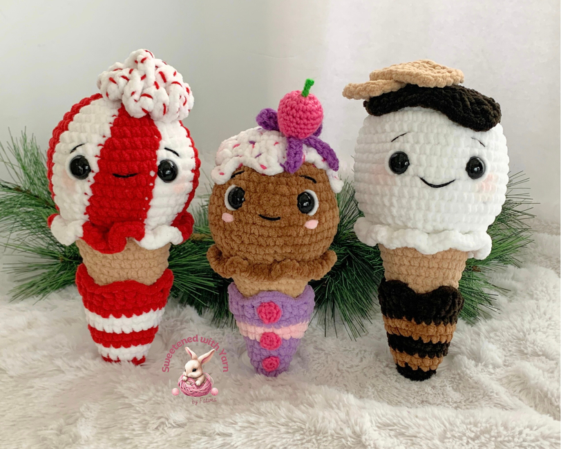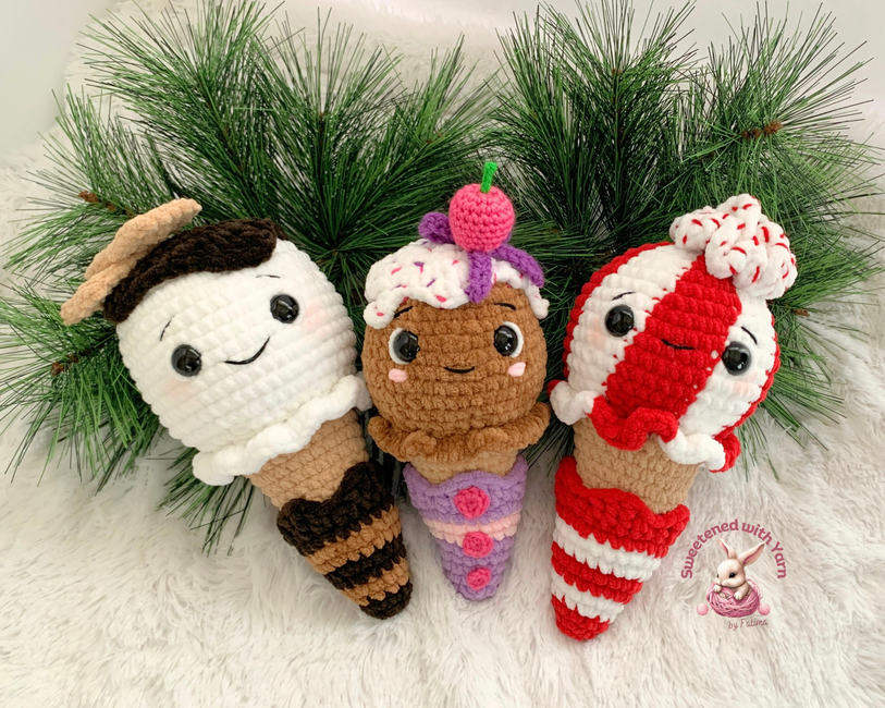 These adorable S'mores, Gingerbread, and Peppermint Ice Cream Cones are truly delightful treats. The cones are available in a variety of collections ... winter sweets & animals, pets, farm animals, zoo animals, spooky-cute, and more already in the works. Each crochet is a quick, whimsical journey, perfect for market makes or a relaxing project at home.