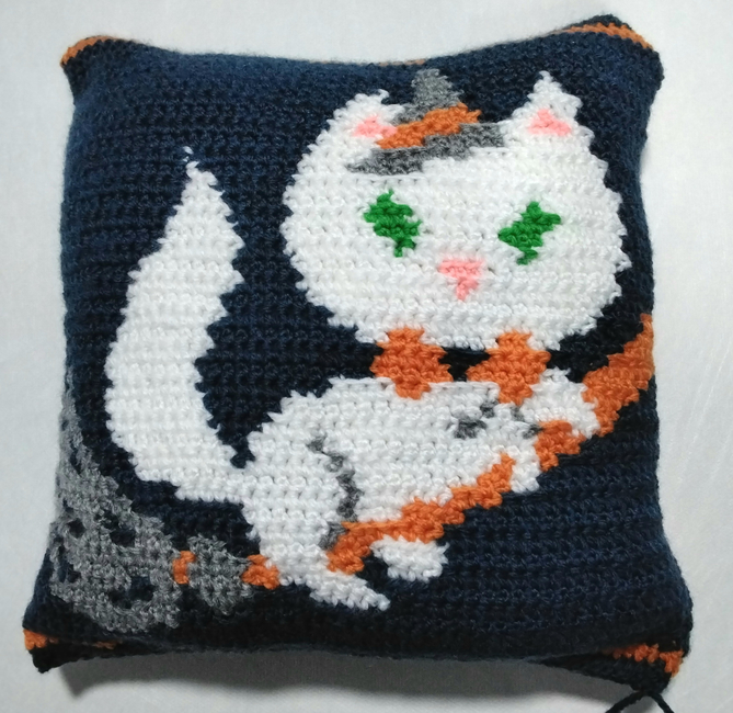 You can use this pattern for a wall hanging or make two and it's the perfect size for a pillow . If you get the other pattern "Vampire cat" you can make a pillow with a pattern on each side, like the one on the image.