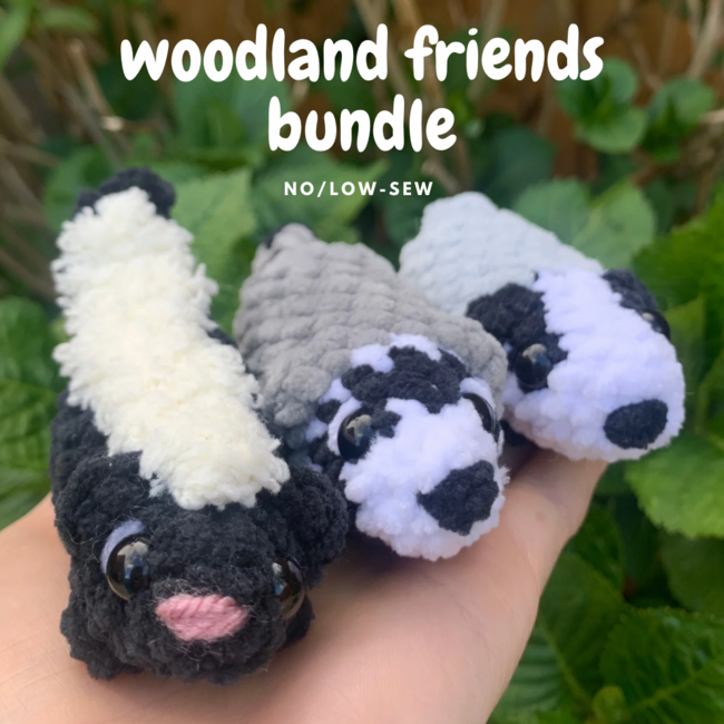 All three patterns require bobble stitches, the badger and raccoon patterns require colour changing! All patterns are quick to work up, the only sewing involved in the skunk pattern is the attaching of the white stripe!