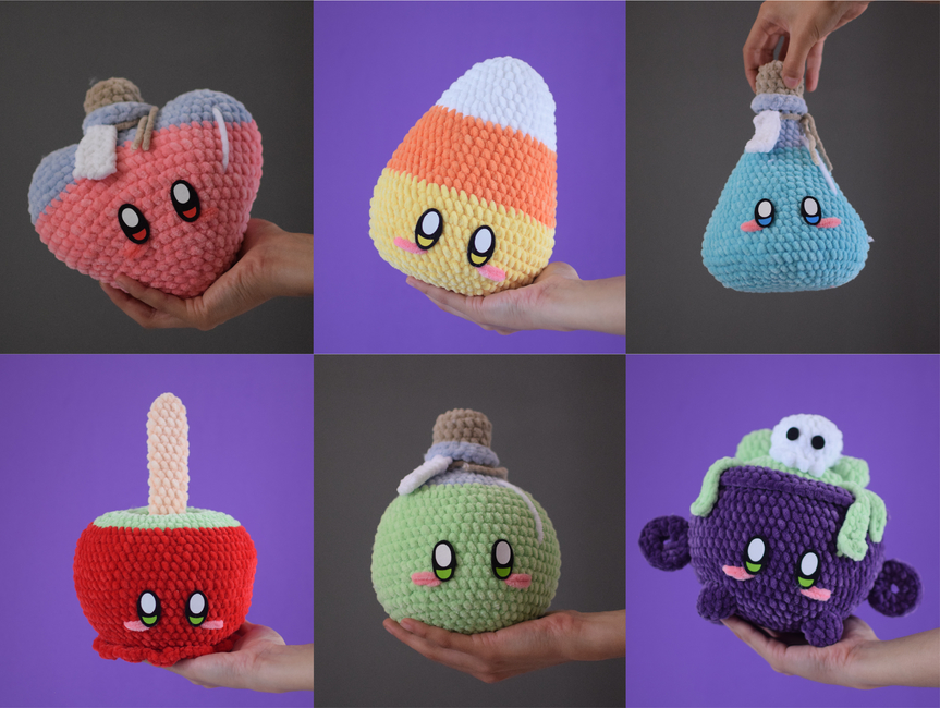 Wooli Halloween Plarty - Carmelo the Candy Corn, Cory the little Cauldron, Mell the Candy Apple, Cuddli, Swetti and Lucki the Potions