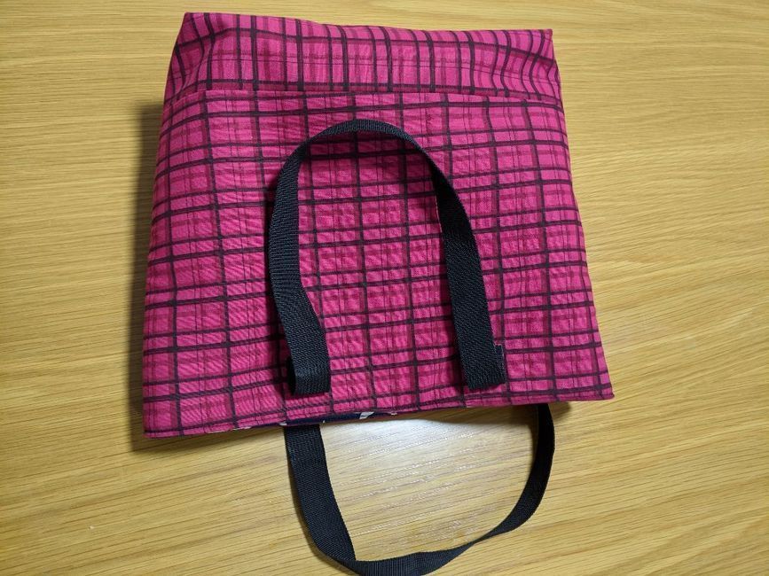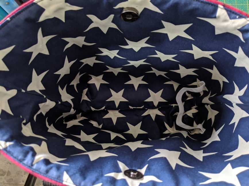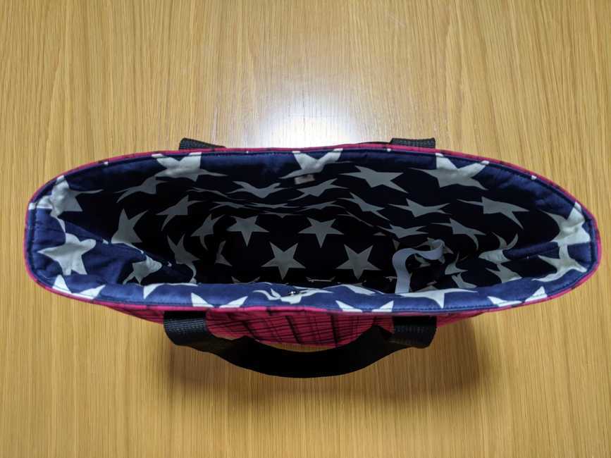 This is a small tote bag with magnetic closure and a bottle holder inside.