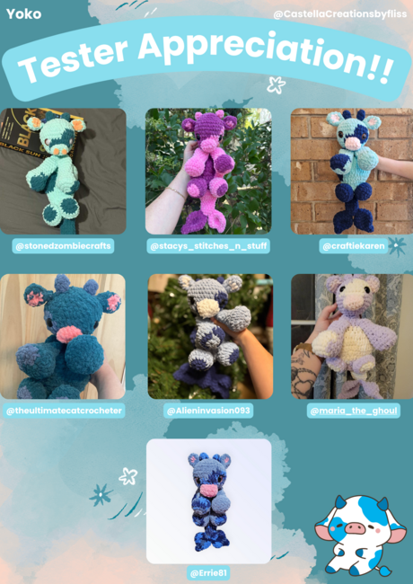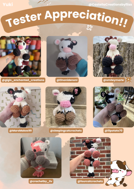 CastellaCreations designed the Yoko & Yuki cow snugglers pattern. Find more of their patterns on their Ribblr shop page.