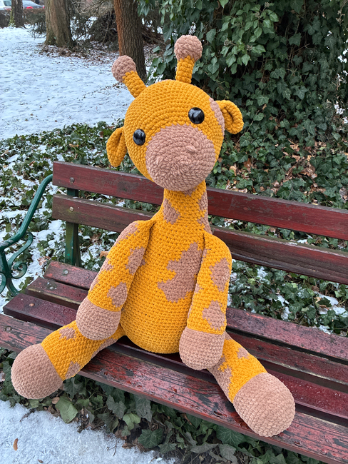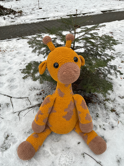 To make Zaneta the Giant Giraffe you will need: main colour - I used 8 skeins of Alize Velluto, contrast colour - I used 5 skeins of Alize Velutto, safety eyes (optional, I used 40 mm), a sewing needle, stitch markers, stuffing. Tools required: a crochet hook that suits your yarn (I used a 6 mm).