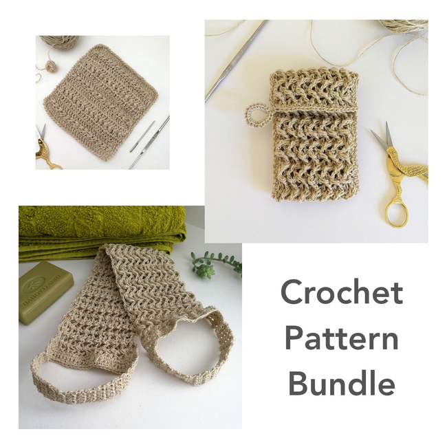 A zero waste bathroom pattern bundle which includes a chevron styled soap saver, a chevron back scrubber and a dishcloth (which can be used as a washcloth). Together they would make a gorgeous bathroom set, perfect for making gifts or for simply making zero waste swaps in your own bathroom.