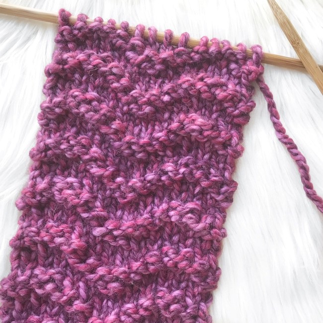 The Zig Zag design of this pattern is made by contrast between the knit and purl stitches and is knit over a 10 row repeat.