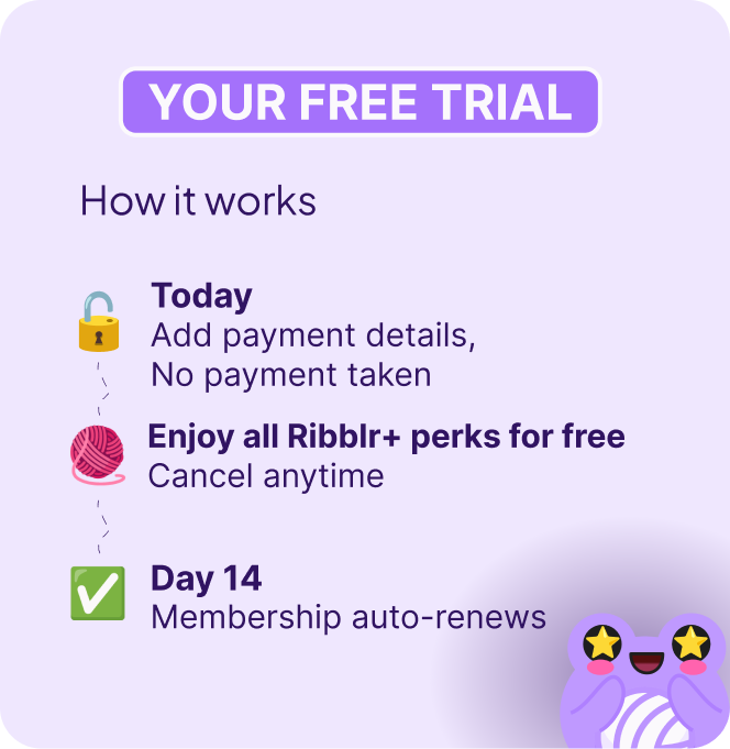 Join Ribblr+ and unlock unlimited free pattern claims, exclusive premium gifts, and more.